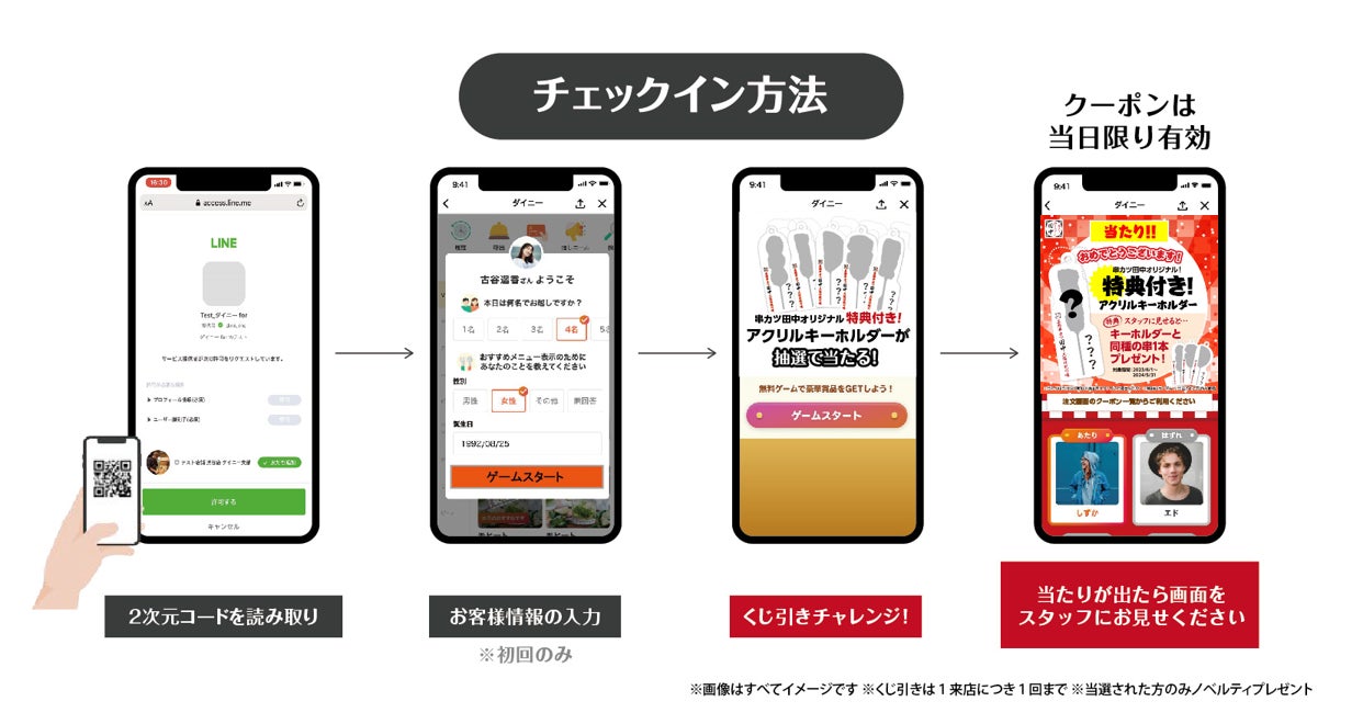 串カツ田中でのお食事をもっと楽しみにしていただけるよう、チェックインしていただいた際にミニゲーム(おみくじ)にもチャレンジできます。