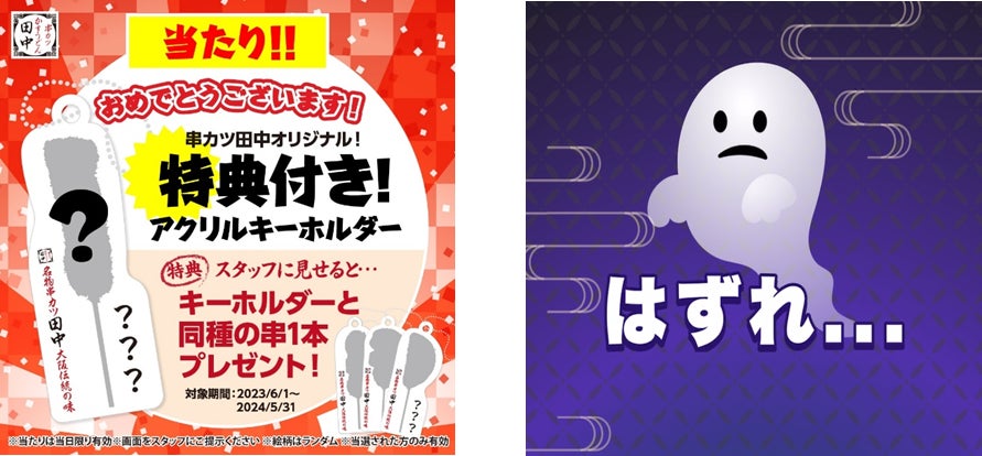 6月12日(月)からは、「当たり」の画面が出たら、全5種類ある「特典付きアクリルキーホルダー」を1つプレゼントいたします。アクリルキーホルダーにはそれぞれ串カツがプリントされており、スタッフにご提示いただくと、同種の串カツを1本プレゼントいたします。