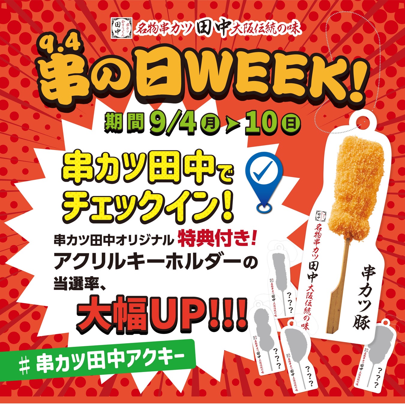 株式会社串カツ田中ホールディングス(本社:東京都品川区東五反田、代表取締役社長:坂本 壽男)が展開する「串カツ田中」は、2023年9月4日(月)~10日(日)の期間限定で、「9」と「4」の日にちにかけた「串の日WEEK」を実施いたします。