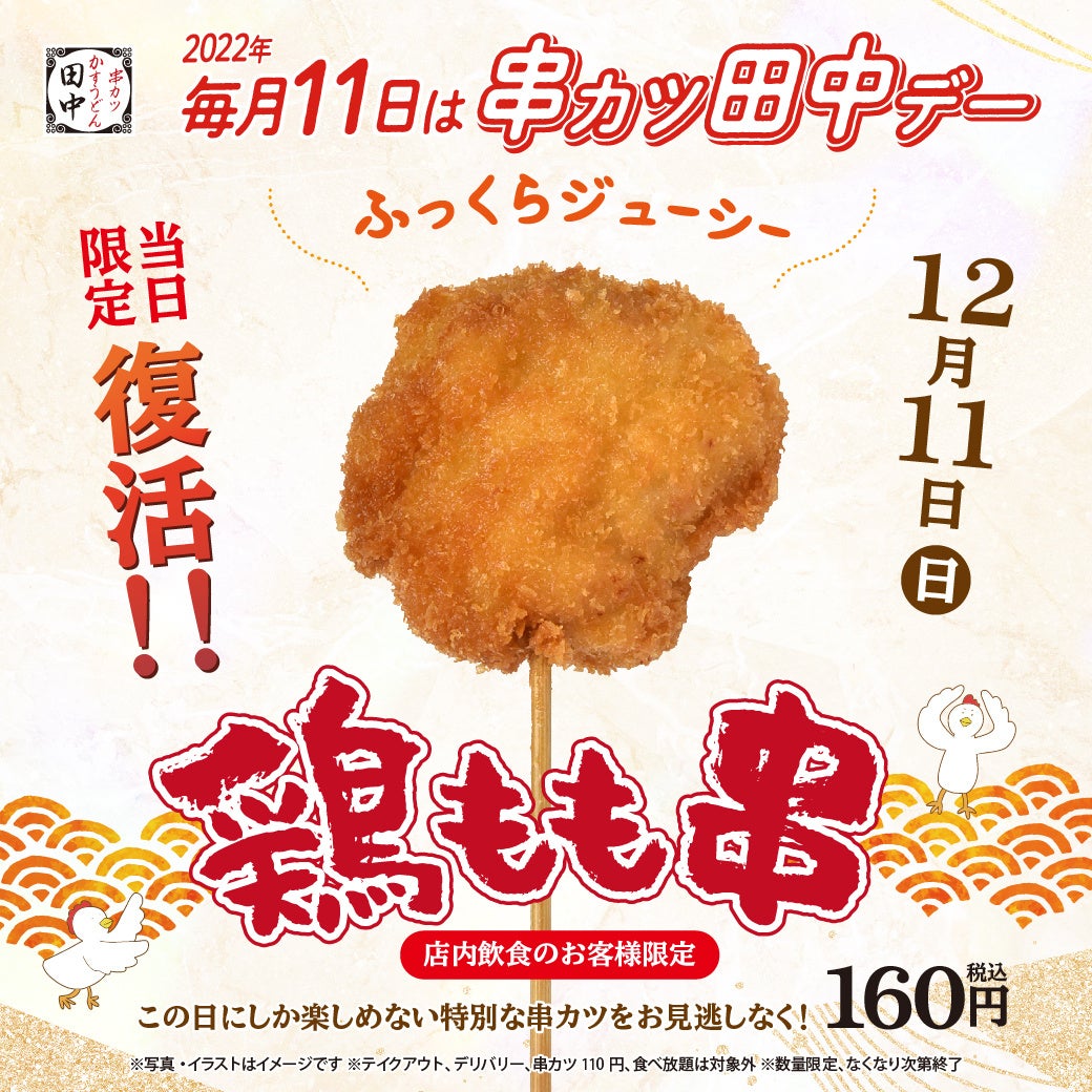株式会社串カツ田中ホールディングス(本社:東京都品川区東五反田、代表取締役社長:坂本 壽男)は、お客様に店内でのお食事を楽しんでいただくため、2022年1月より「串」の形に見立てた毎月11日を「串カツ田中デー」として、その日限りの特別な串カツを販売しております。12月11日(日)は、2年ぶりの復活となる「鶏もも串」を当日限定で販売いたします。