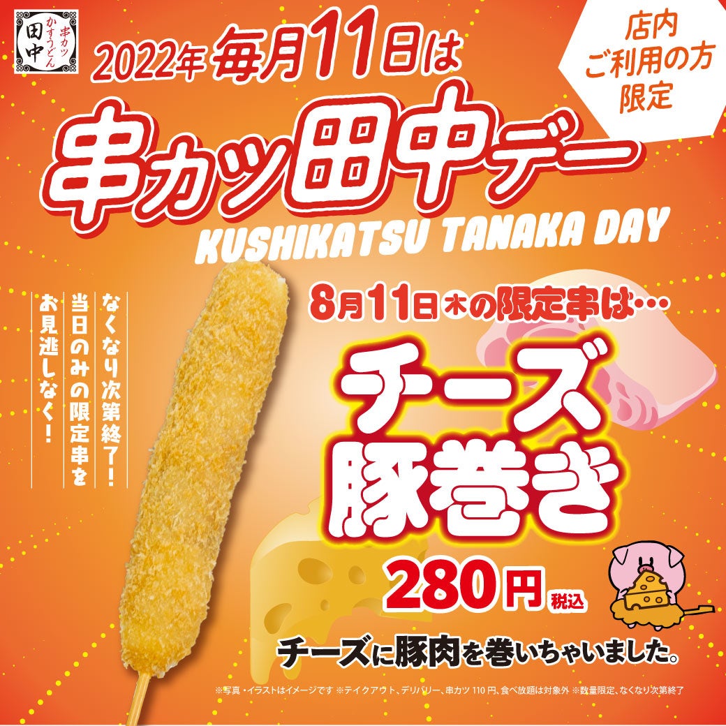 株式会社串カツ田中ホールディングス(本社:東京都品川区東五反田、代表取締役社長:坂本 壽男、以下:串カツ田中)は、より一層お客様に楽しんでいただくため、2022年1月より毎月11日を「串カツ田中デー」として、毎月限定の串カツを販売しております。 「串」の形に見立てた毎月11日の単日限定で、店内利用のお客様のみを対象とした特別串となっております(テイクアウト専門店を除く)。8月11日(木)は、先月に引き続き大人気の「豚巻き」シリーズです。今回は女性や子どもに大人気の「チーズ」串をジューシーな豚肉で巻いた「チーズ豚巻き」を販売いたします。