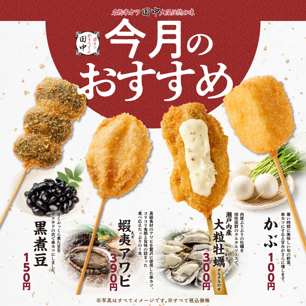 昨年12月8日より販売開始している『瀬戸内産 大粒牡蠣 タルタルのせ』や、そのほかの季節メニューも継続して販売しますので、今回の新メニューと併せて冬の串カツ田中をお楽しみください。