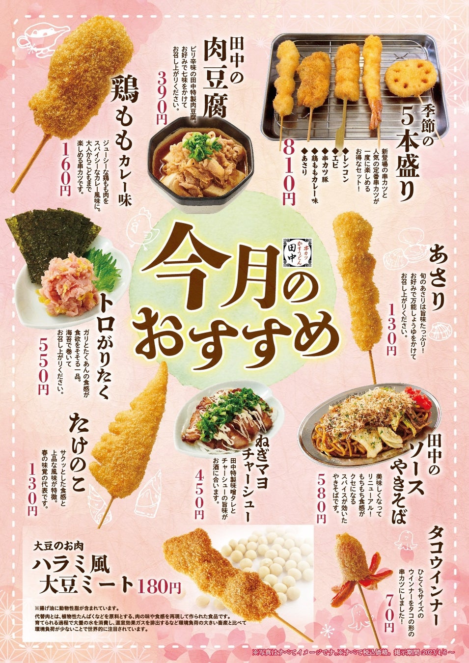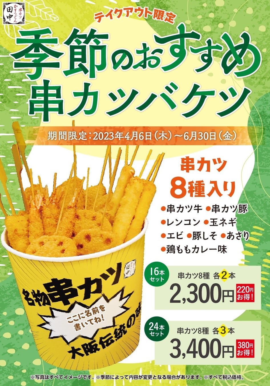 株式会社串カツ田中ホールディングス(本社:東京都品川区東五反田、代表取締役社長:坂本 壽男)は、2023年4月6日(木)より、季節のおすすめメニュー15品と、テイクアウト・デリバリー限定でお楽しみいただける「季節のおすすめ串カツバケツ」の販売を開始いたします。