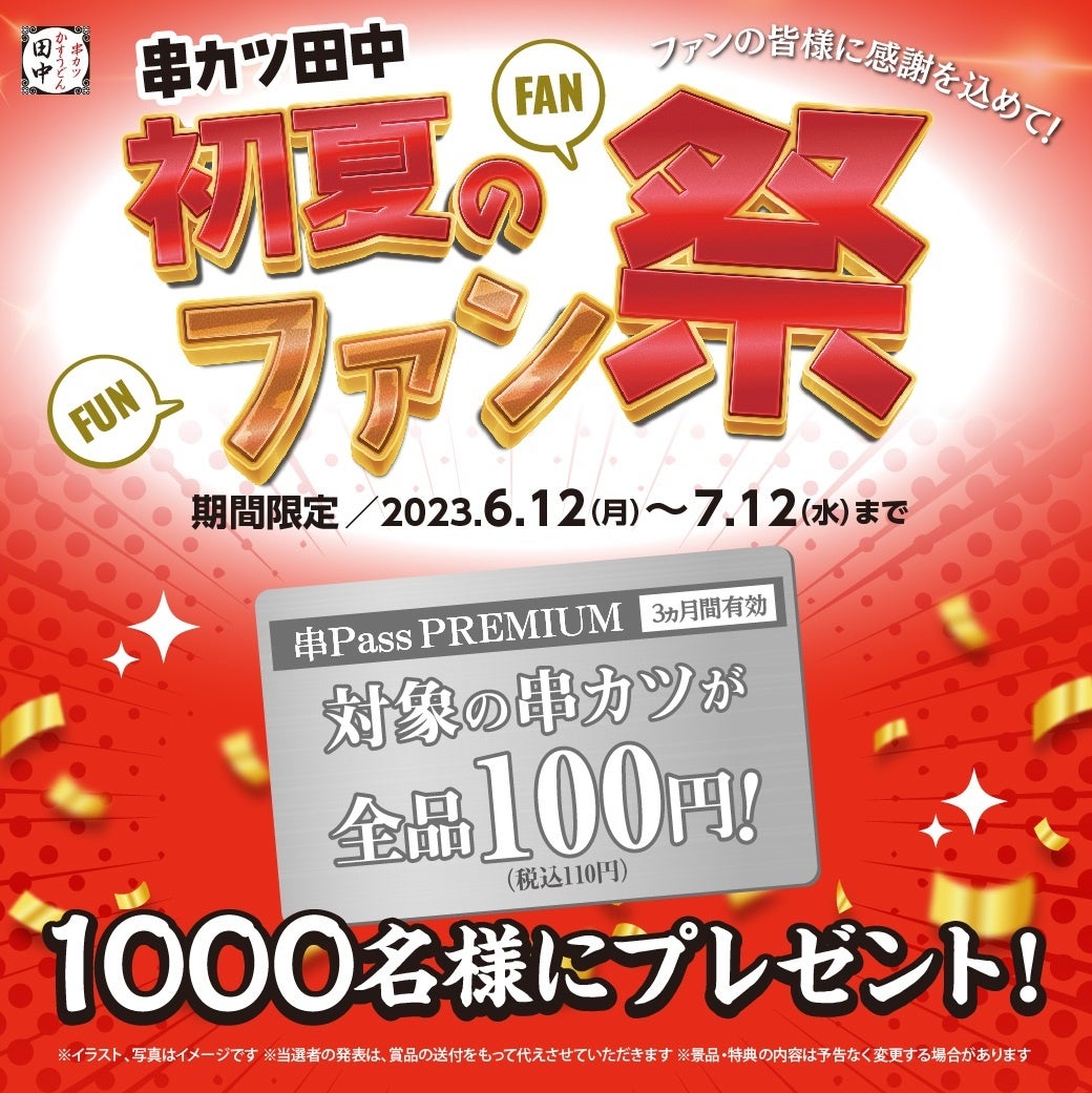 このサービス開始を記念して、2023年6月12日(月)~7月12日(水)の期間で、「串カツ田中 初夏のファン祭」キャンペーンを実施します。期間中にチェックインしていただいたお客様全員を対象に、串カツが100円(税込110円)になる「串Pass PREMIUM」を抽選で1,000名様へプレゼントいたします。